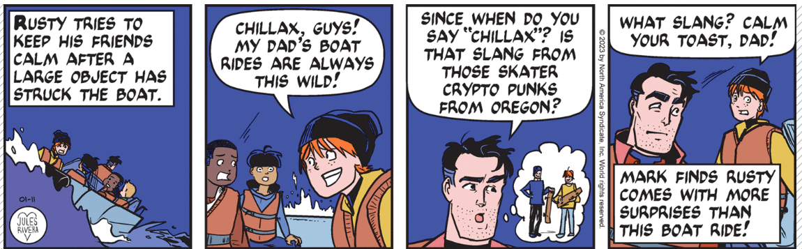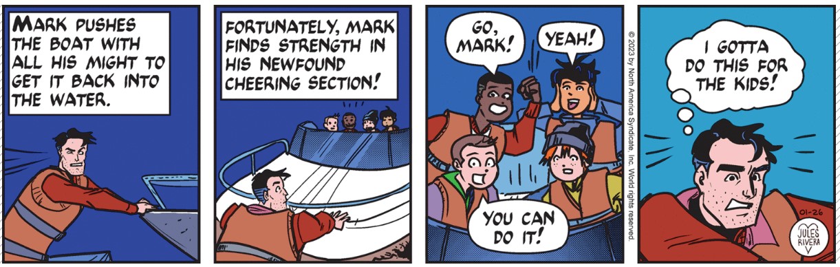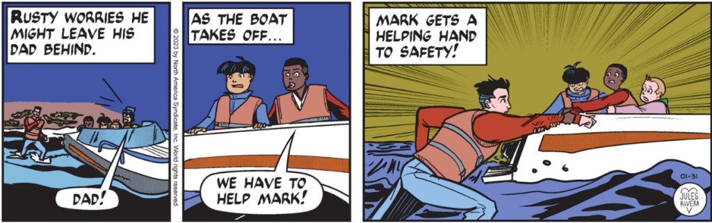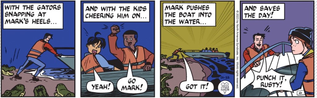 There is a casual familiarity these days where adults and parents no longer get to be called “Mr. Trail” or “Ms. Trail”. We’re all on the same level, regardless of age, education, or number of TikTok (or BikBok) followers. In any event, seems like this rescue is more for effect than reality; in spite of the sun ray effect in panel 3 that apparently symbolizes a significant action. I reckon the kids think so. If Mark is worried, he’s probably worried that Rusty will actually panic and gun the boat, leaving him behind. So, the kids have an adventure to tell their parents and friends. And most likely, those parents will wonder whether to bring a lawsuit against Mark for child endangerment. But that wouldn’t happen to Mark Trail, would it?