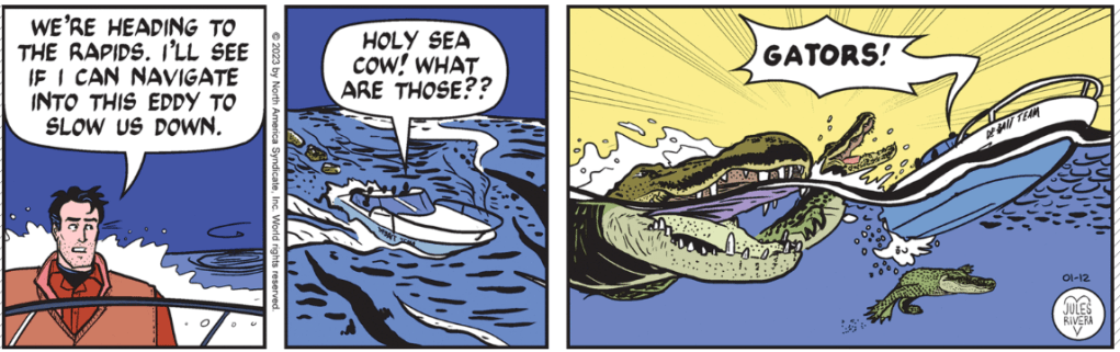 Is Mark wearing some kind of inflated suit? It sure looks big and stiff. Okay, I suppose Mark sometimes does seem like a Gilligan (as faithful reader Daniel commented), but as for today, he is going all “Robin” on those alligators. But “holysea cow”!? Not even close, Mark! The original Steller’s sea cow was discovered and hunted to extinction in the 18th century. Nowadays, “sea cow” is often used as a nickname for manatees, who are herbivores. Anyway, Mark should have yelled out something more appropriate, such as “Holy swimming luggage!”, so that the kids could at least have responded “Huh?”