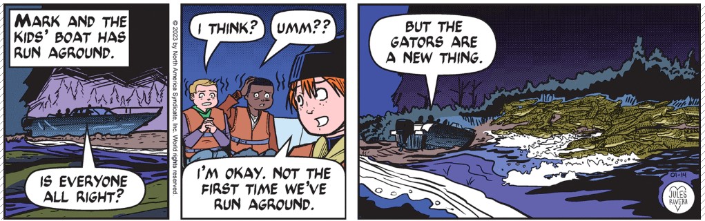 Did you happen to miss the strips for this week? Well, pick one day and you’ve got the gist. That is to say (and I’m saying it, er, writing it), this week featured Mark huffing and puffing and pushing that beached powerboat off the sandy shore and back into the water so the kids could safely get away from the gators. Oh, the alligators! We can’t forget them, can we?