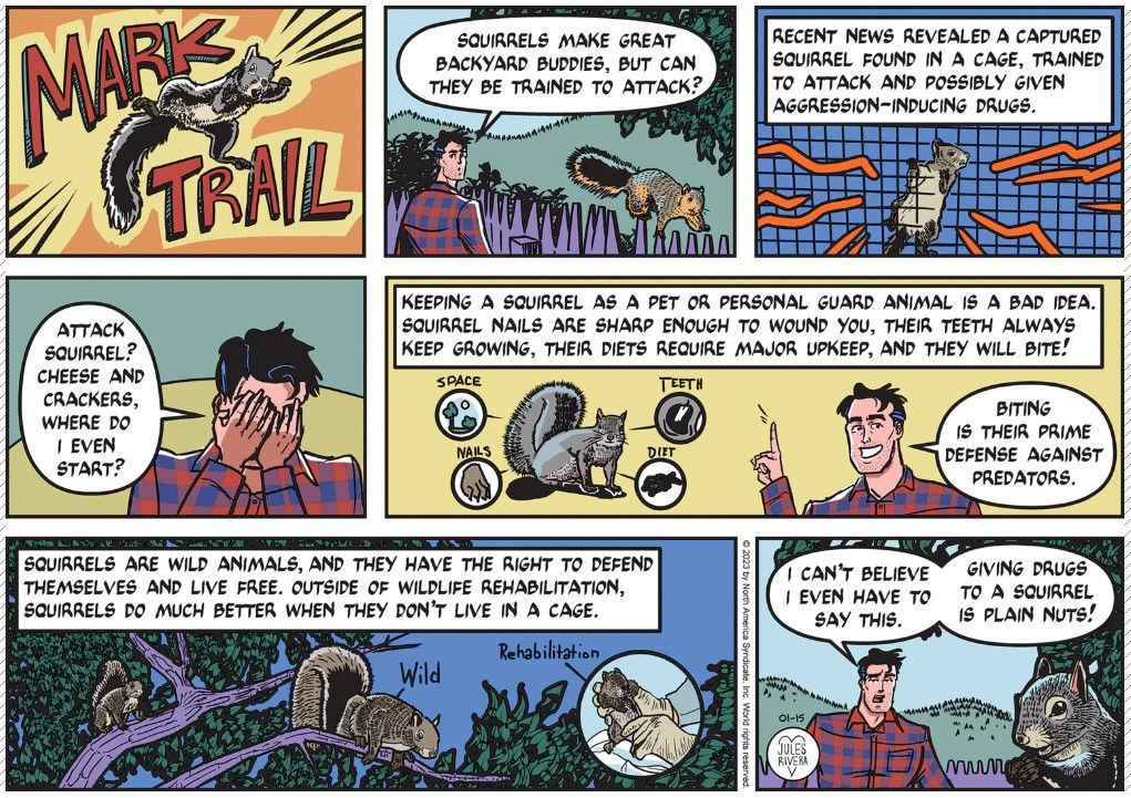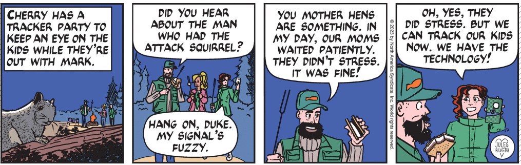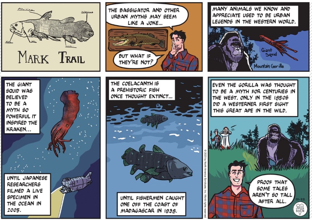 I wonder if today’s strip is an insider-salute to Rivera’s predecessors. Why? All of the text entries end with an apostrophe! Anyway, I have to correct Rivera once again: This is not Mark Trail’s cryptid hunt. It is Rusty’s cryptid hunt. Mark is simply the driver, who is screwing things up.