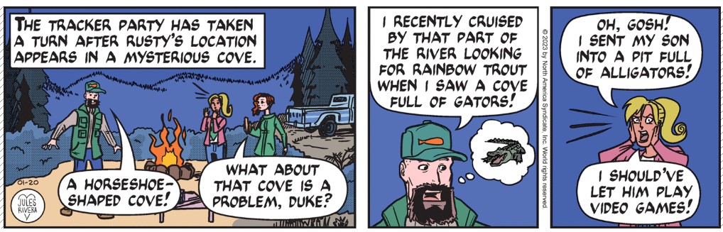 In any event, the adventure this week focused on a growing realization that something might be wrong with the Bassigator Hunting Party, based on Cherry’s tracking device (surreptitiously dropped into Rusty’s backpack) showing a total lack of movement on Cherry’s tracking app. Seems the tracker stopped at an unknownhorseshoe-shapedcove in the river (as Duke described it). Neither Cherry nor Jeanette knew about it, but de-bait team member Duke described it as a hot-spot for alligators. Curiously, everybody seemed intent on referring to the cove all week long as “the horseshoe-shaped cove”, as if the shape, itself, was somehow important. Do alligators play horseshoes? Is the shape symbolic of an alligator’s womb?