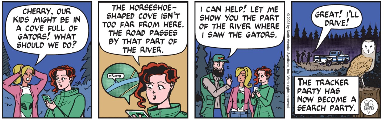 As for Cherry, you might recall that the week before, she figured something was wrong when Rusty’s tracking device didn’t move away from the alligator cove. She, Jeanette, and Duke piled into his truck and went off to rescue the boating party. But they didn’t show up. Perhaps they got distracted by last week’s Sunday nature strip. Will that happen again, today?