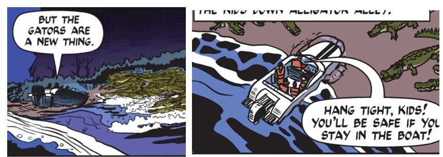 Mark tried to gloss over this mishap with the kids, but the waters suddenly started getting rough. A growing swarm of gators who were none too happy with Mark’s piloting skills were making themselves known. Whether he was boating into rapids or churning waters somehow created by the gators, Mark was unable to keep a steady course or even pilot the boat away from the trouble. For someone claiming to know how to operate a power boat, that’s disappointing. Anyway, the boat ran aground onto a beach as if it was D-Day. Unfortunately, they grounded alongside a giant collection of upset gators! Good thing gators can’t jump.