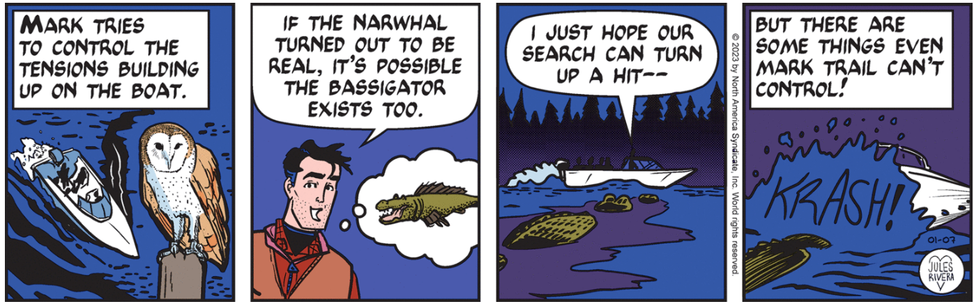 Jokes aside, “krashing” a boat in dangerous waters is a bad deal. Did Mark run over an alligator? That could land him in real trouble with federal authorities! I wonder if this is this going to be a turning point in the story where we see some actual danger and suspense, rather than the usual outlandish situations.