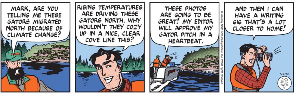 And as I (or we) suspected, gig-worker Mark took this boat trip to gather data for a story he will shop to his editor(s). His angle will likely be the effects of climate change, while hopefully excluding the erroneous notion of Arctic pack ice and rising water. Regular reader and commenter Downpuppy has provided knowledgeable comments on this point. But another reason for northern migration of alligators is loss of habitat due to human development.