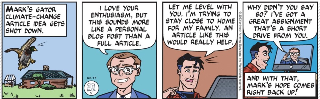 Contrary to some opinions, I don’t think going back to Teen Girl Sparkle is a great idea. As there are many magazines owned by one parent company that hires Mark, how about having Mark work for magazine #6 or #9, for example? I thought one of the interesting notions of this multi-magazine concept was that Mark would get a variety of assignments from a variety of chief editors and trying to fit his work into different magazine formats. Lots of opportunities for variety and drama in that concept. Only, most assignments have come from Amy Lee at Teen Girl Sparkle, with one from Rafael Suave of Hot Catch magazine (the zebra mussels affair).