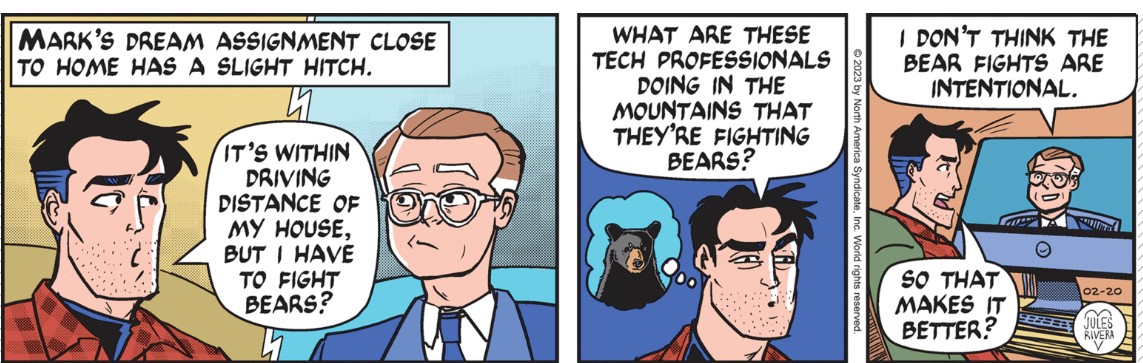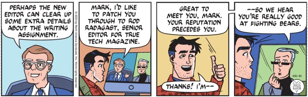 Monday: Yes, exactly where did the STEM nerds set up their retreat? And what are they doing—leaving their food out in the open in picnic baskets? I don’t know about you, but if this strip was animated, I’d bet that Bill Ellis would come off like Max Headroom, the pioneering “A.I. TV avatar” of the 1980s. Otherwise, I think we’re back to another adventure in Crazy Time.