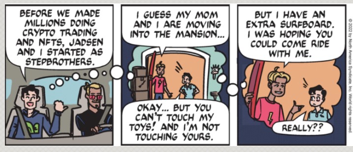 Looking back to the Zebra Mussels story comes the following depiction (11/11/21). It may be unique but requires context. Earlier in the story (11/04/21), Diana Daggers lamented to Mark that she was angry to discover that her boss—Professor Bee Sharp—was investing her salary in NFTs and converting it into digital currency. Note that nowhere else in the strip for 11/11/21 is Diana mentioned or shown!