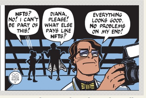 While Sharp reviews new photos for NFTs, the background scene is his own visualization of what Diana revealed to Mark. The link between present and past is not a highlighted body or thought bubbles, but the use of color and silhouette. And Sharp is clearly in the room twice: as a silhouette in the past and himself in the present (note the light on his shoulders). Perhaps Sharp’s “No problems on my end!” comment textually applies to the photos as well as his talk with Daggers as he recalls the earlier encounter.