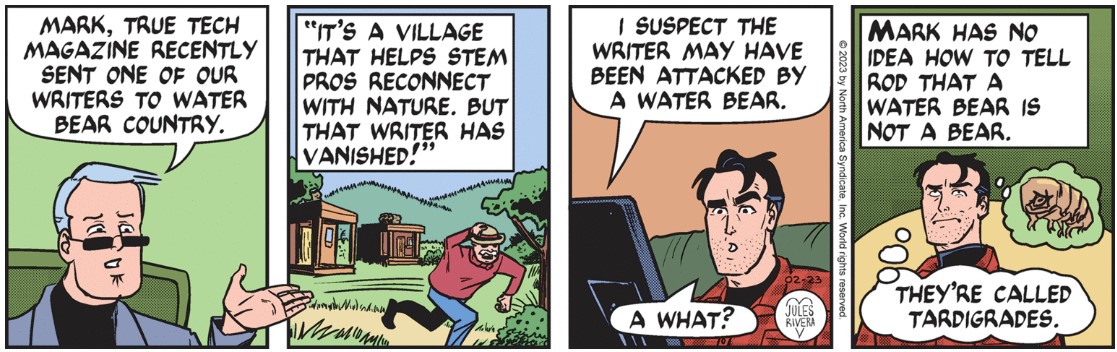 From the family vacation in Oregon (03/24/22) comes another technique involving thought balloon bubbles floating across multiple panels to illustrate a past sequence of events. The narrated past action begins in panel 2 and continues into panel 3. Obviously, the amount of dialog and action meant that Rivera could not use the prior technique. Rod Radagast’s overlapping hand in today’s strip is a variant of this one, reinforced by the “quoted dialog” in the textbox.