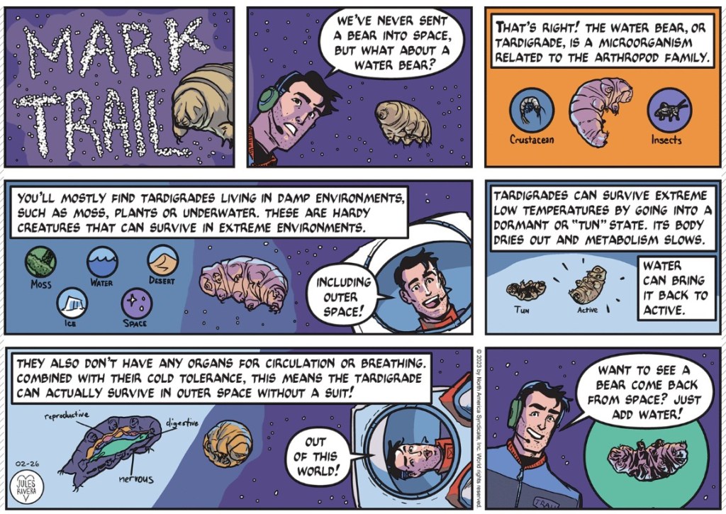 Water bears? What a surprise! Clearly, the outer space gimmick has Rivera’s attention, since she repeats the assocation. But what else can one say about tardigrades? They don’t make good pets. They are food for other tiny creatures.