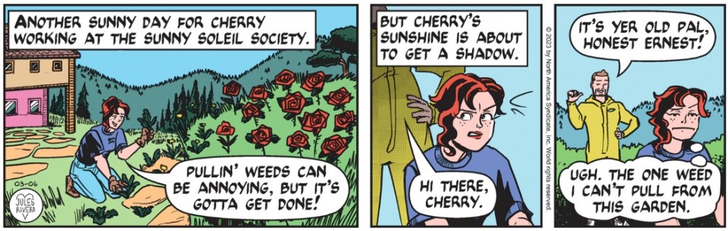 We turned our attention to Cherry this past week, where we found her once again working in the gardens of the Sunny Soleil Society, as if nothing bad has happened! I would have expected to see her fired by Violet Cheshire after that dustup with Honest Ernest’s lawn treatment gig and the revelation of their secret tryst.