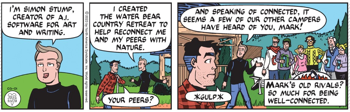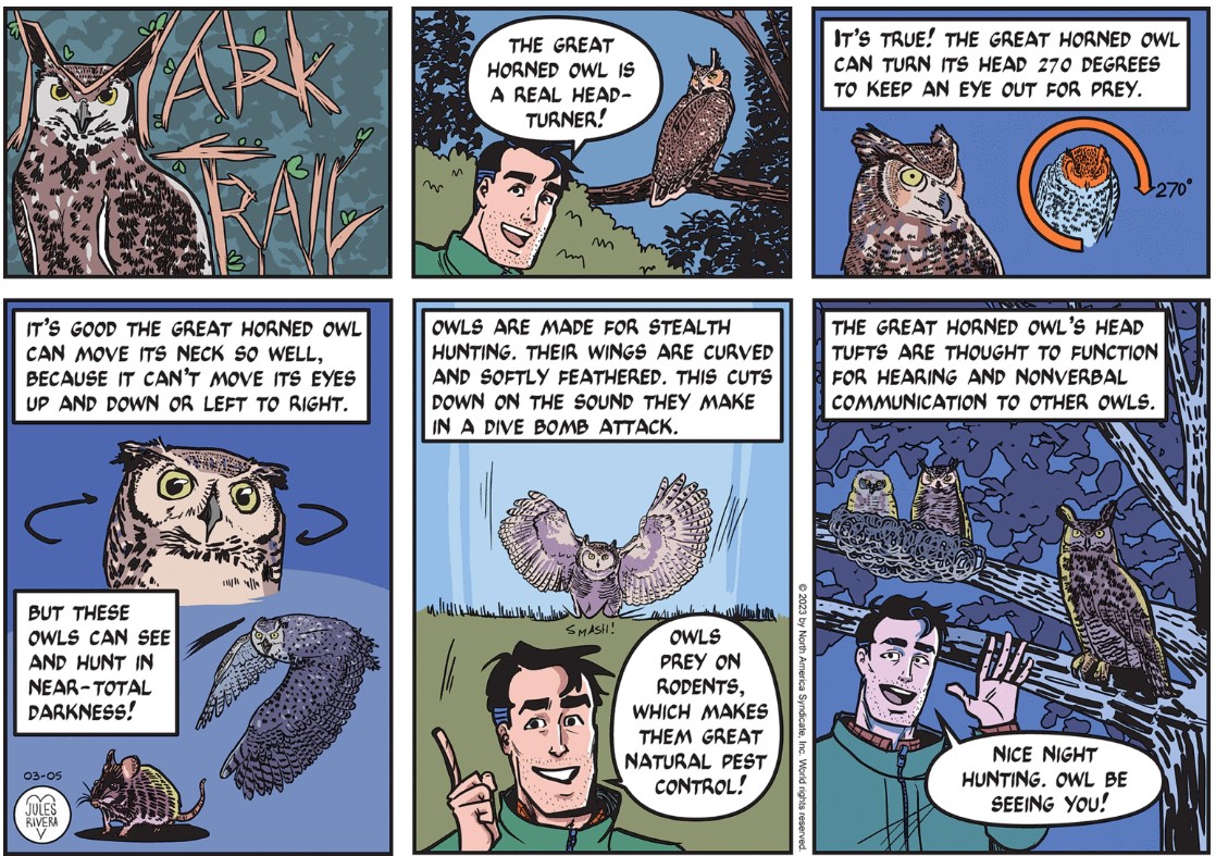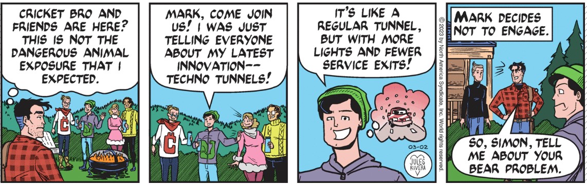 Have to admit that, once again, I like her Sunday title panels. Unlike most strips that use a standard logo-style panel or none at all, Rivera always creates a customized panel that tries to fit the strip’s theme. Having said that, I’ll also award some points for a topic I doubt was covered by prior Trail artists. But I would have thought she would focus on forest fires, for example. Anyway, I think today’s strip looks hurriedly designed. And it is probably a bit too wordy for a strip issuing cautionary advice.