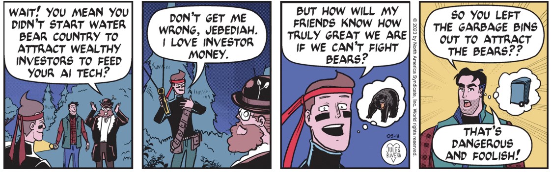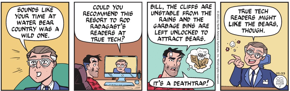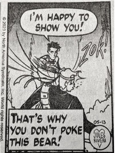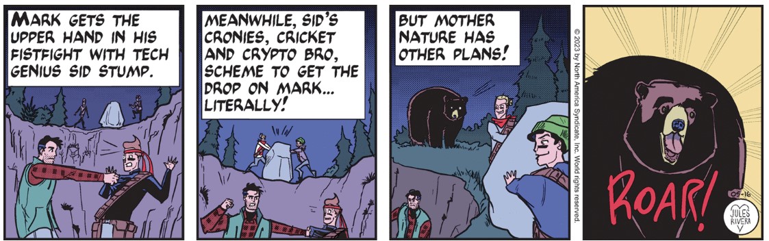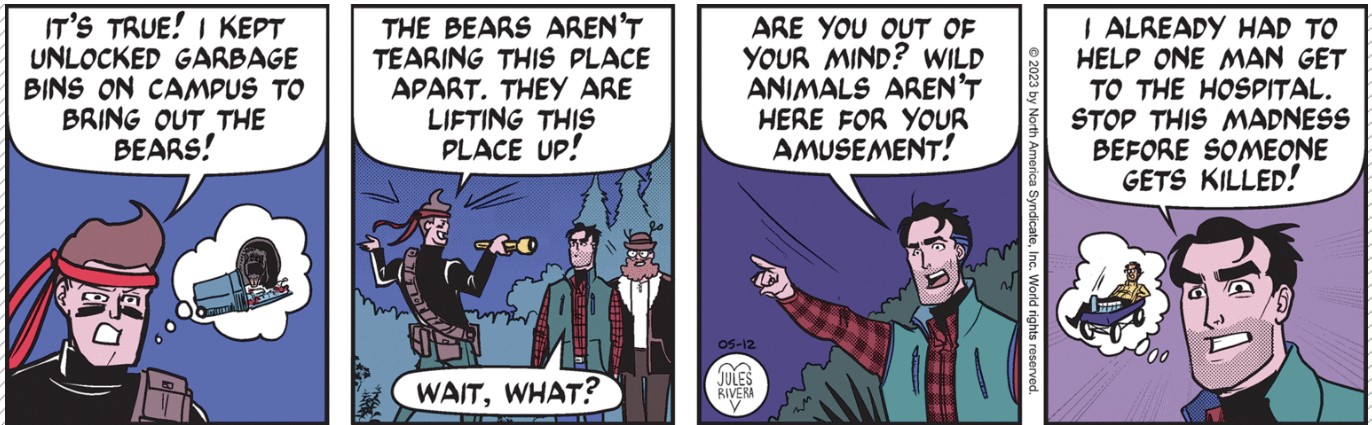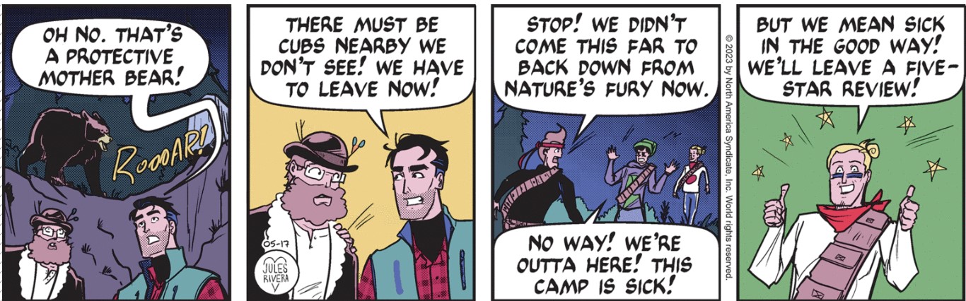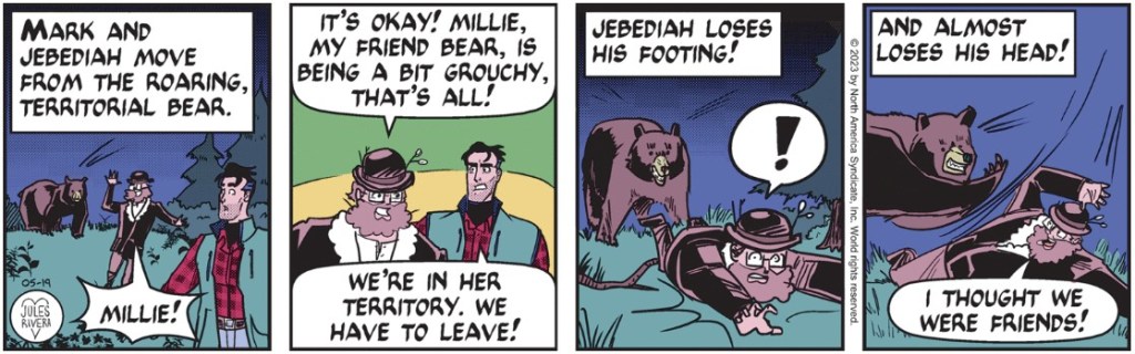 I’m starting (?) to sound and think like commenters on CK. Clearly, Rivera thought it was worth the effort to use two comment boxes (panels 3 and 4) to make a joke at the expense of adding anything to the narrative. She needn’t have bothered, since the bear drawings, alone, should elicit more laughter than any joke she could publish. Compared to what Rivera normally publishes on Sundays, the bear we see here looks like it could have been drawn by Rivera’s pre-teen niece. No insult intended to her niece.