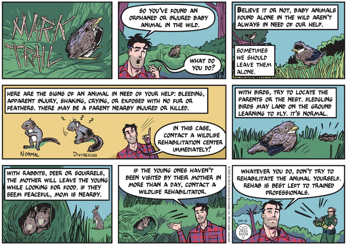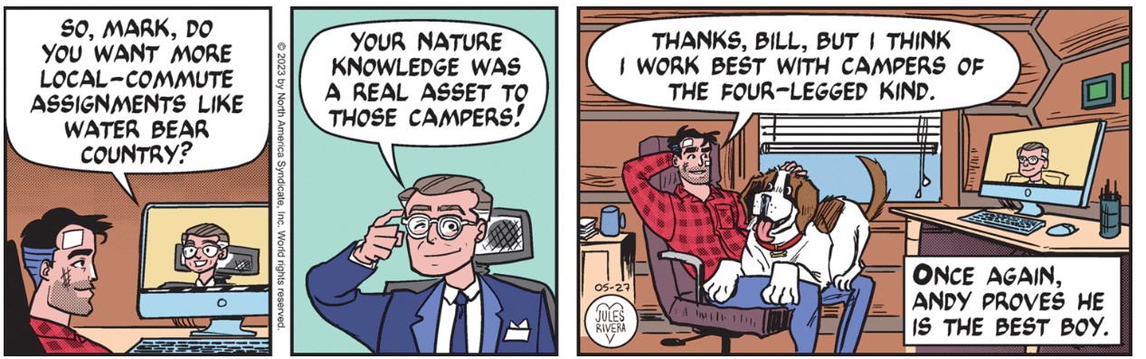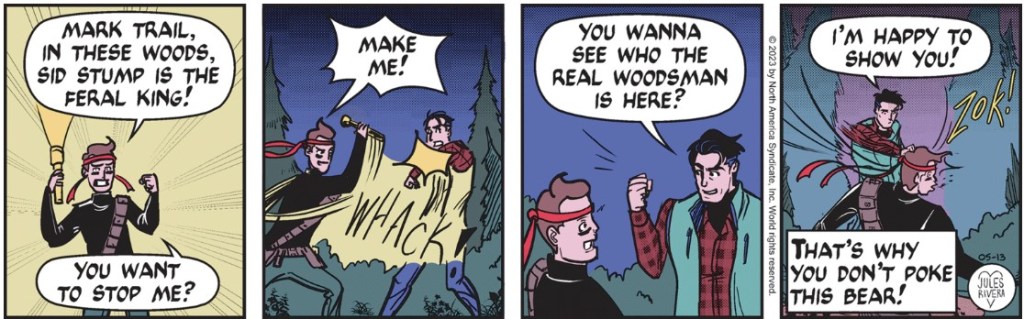 Are we now at the end of another adventure? In the pre-Rivera era of Mark Trail, I would say Yes! Mark’s adventures often ended abruptly with little attempt to tie up loose ends before his sudden reappearance back home in Lost Forest. So while we wait for Monday’s strip, let’s check in with the Sunday submission.