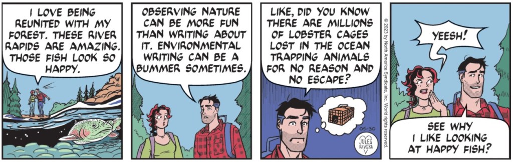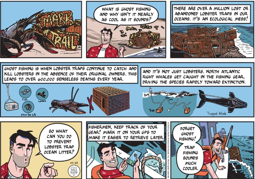 Do lobstermen read the comics? I have never heard of “ghost fishing”, so I did the usual online “high-school paper” research. While all of what Rivers wrote here plays out, it’s too bad she didn’t have room to note some initiatives to clean up this mess: There is the NOAA Marine Debris Program to provide locations and means for professional fishermen to safely dispose of old, obsolete gear. There are also several NGOs involved in providing technologies for safe retrieval of ghost gear in our seas and oceans. All of that deals with the larger issue of ghost gear involved in general, large-scale fishing, such as the loss or abandonment of fishing nets. And the global quantity is unknown.