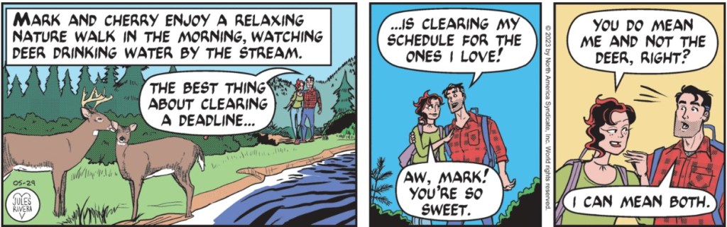 Moving on: Regarding Mark’s beard, keep in mind that Sunday strips are often composed weeks before they are posted, most likely before Saturday’s strip. Otherwise, good content, but rather quickly knocked out. Even Mark looks like he just woke up in time for his talk. Yeah, I’m surprised. Rivera usually takes more time on the Sunday strips. Today’s panels look like they are entries for a “Fill in for Jules Rivera Who is On Vacation” contest. No winners here.
