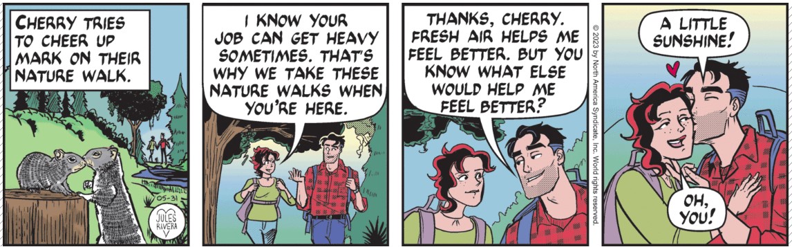 So, Mark wants a little sunshine, does he? The two squirrels in panel 1 are an obvious lead-in to the meaning of Mark’s coded phrase in panel 4 and its expected outcome. Maybe now we’ll learn what’s in Mark’s and Cherry’s backpacks. Warning: Parents may need to screen tomorrow’s strip before the kids see it.