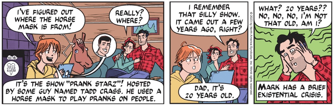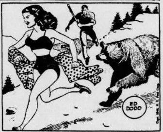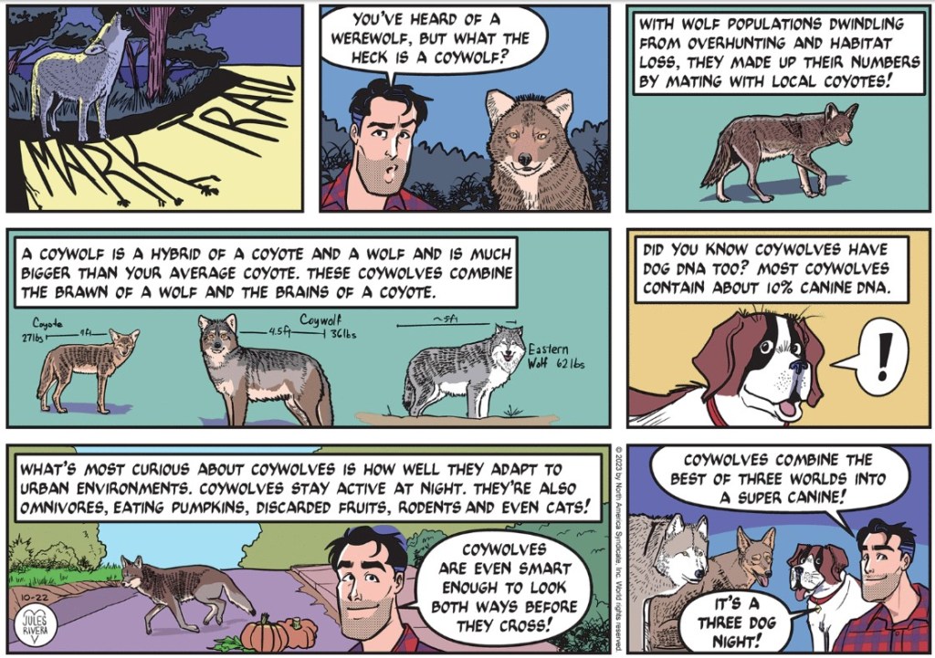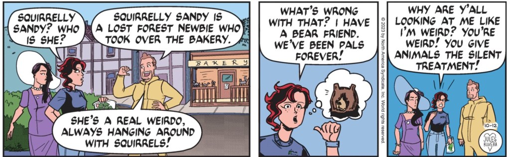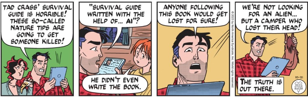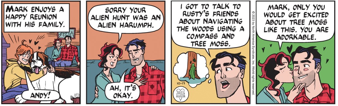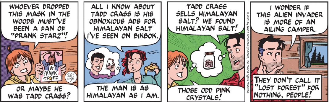 Whatever the case, we’ve obviously reached one of those dramatic highpoints where Rusty is surprised and unsure just who—or what—is staring at him from within the bushes. But it’s probably not a Klingon. I hope it’s not that flaky reporter—Jebediah—Mark ran into while on assignment to investigate bear assaults at that fake mountain retreat.