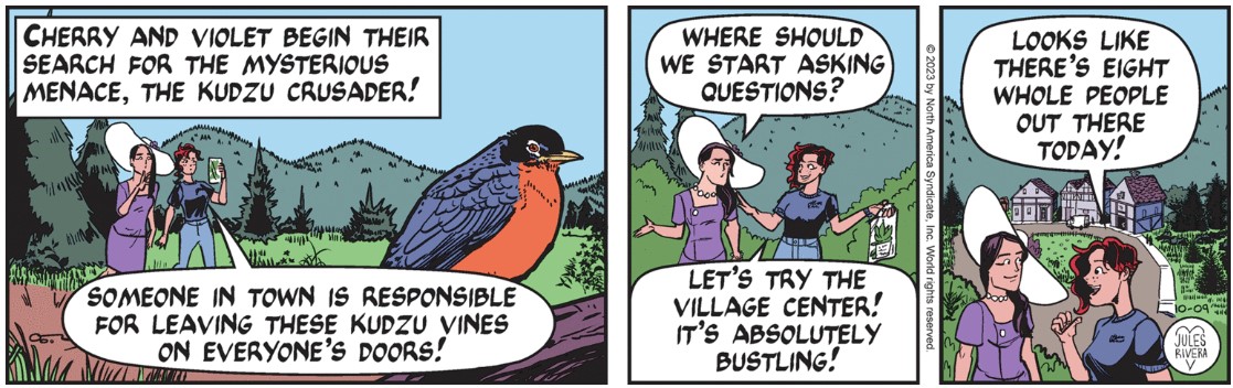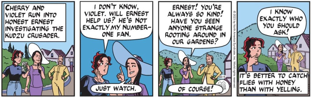 In spite of her questionable grammar in panel 3, I’m still perplexed why Cherry has bought into Violet’s unsupported conspiracy that she is being framed. But it’s the hook for the storyline. Is Honest Ernest too obvious a choice to be the Kudzu Crusader?