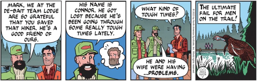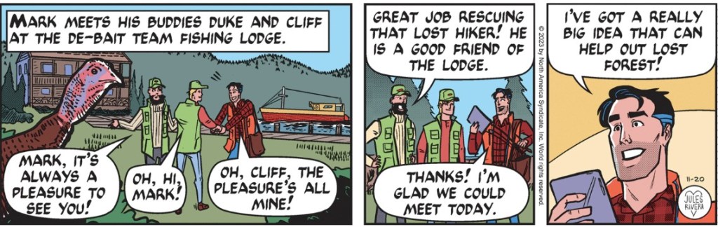 There was not much in the Action Department; this was a week for Man Talk. Mark arrived at the De-BaitTeam’s lodge, where he met up with Duke and Cliff to discuss his idea for a men’s-only nature retreat. Based on the sad plight of the lost-then-found camper (whose name we learned is Connor), Mark expressed strong emotional rage against the bad influence of the error-prone survival guide of Tadd Crass and how it could lead to future disasters for men who live around Lost Forest. Mark must fix that!