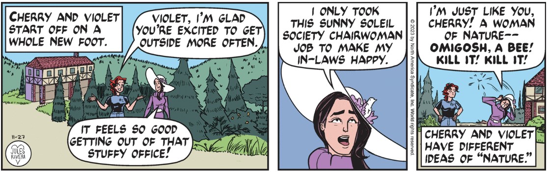 After all that parody (or was it just satire?), it’s nice to get back to Cherry’s more practical, logical stories that … uh, wait. What’s going on here? Didn’t we cover this, already? Cherry is virtually always outside when we see her. And as for a new foot, well, we can’t see it, because Violet’s dialog balloon is in the way (okay, that comment was just cheap sarcasm. By the way, if this strip originated in France, Rivera would probably have written that Cherry and Violet are starting off on a whole new meter. Sometimes it’s hard to constrain my wit).