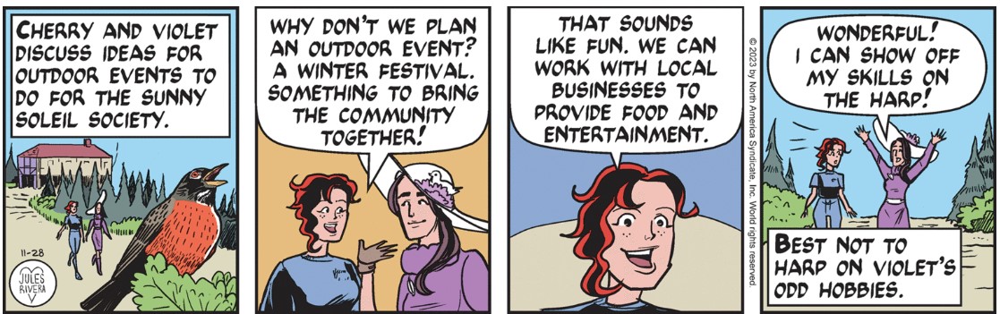 But I like how in panel 3 Cherry answers her own query she posited in panel 2. This rhetorical trick is popular with politicians, sales staff, and other hucksters, as it saves so much time and keeps the sucker one step behind. Cherry deftly proposes that local Lost Forest businesses should shoulder the burden of support for an activity promoting another private business (The Sunny Soleil Society, which acts on behalf of an HOA). Dang! If Cherry can pull this off, she should run for Mayor.