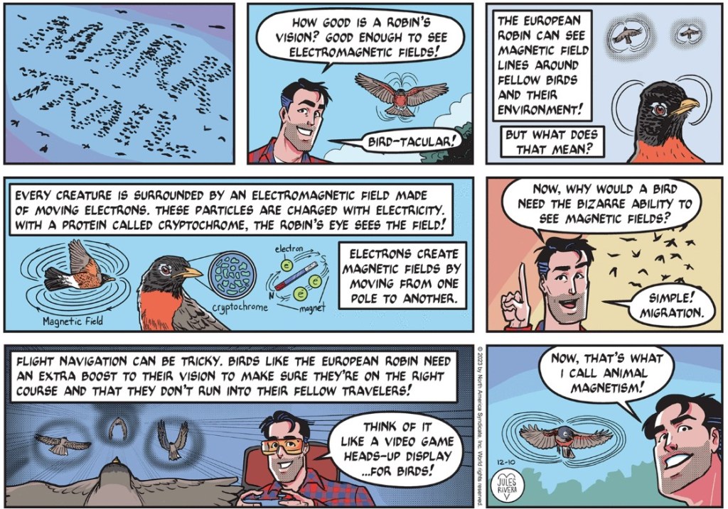 Now this is very interesting. It led me to discover that the European Robin and its American Cousin are not really related, as the American Robin is part of a different genus: Their similarity is cosmetic. The topic was interesting enough for me to do a bit of research. Biology shows that the European Robin (and some other birds) do utilize electromagnetic fields of the earth to help navigate during migration. This process is not fully understood, as far as I can tell, but does not appear to be in doubt. But I saw no mention of animals exhibiting their own electromagnetic fields, or robins using each other’s magnetic field for navigating. Rivera clearly has sources I do not and I’m not a biologist. The literature is complex, so I may just be misreading things. Anybody out there experienced enough to shed any light?