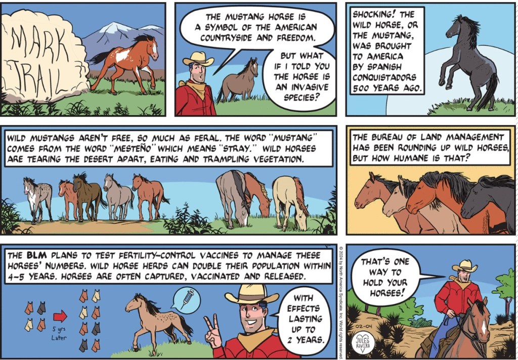 It turns out that—in the real world—wild horses (aka mustangs) have a complex background that involves genetics, ranchers, animals rights activists, land activists, and governments at the local and federal level. None of what I wrote in this paragraph has yet to be brought up in the strip, but seems to underlie the direction of the drama. Let’s hope Rivera presents a fair summation of … oh, who am I kidding!? This is Mark Trail! Whatever Mark decides to do will be considered fair and just. It’s the way things are in the Trailverse. So hang on, buckaroos!