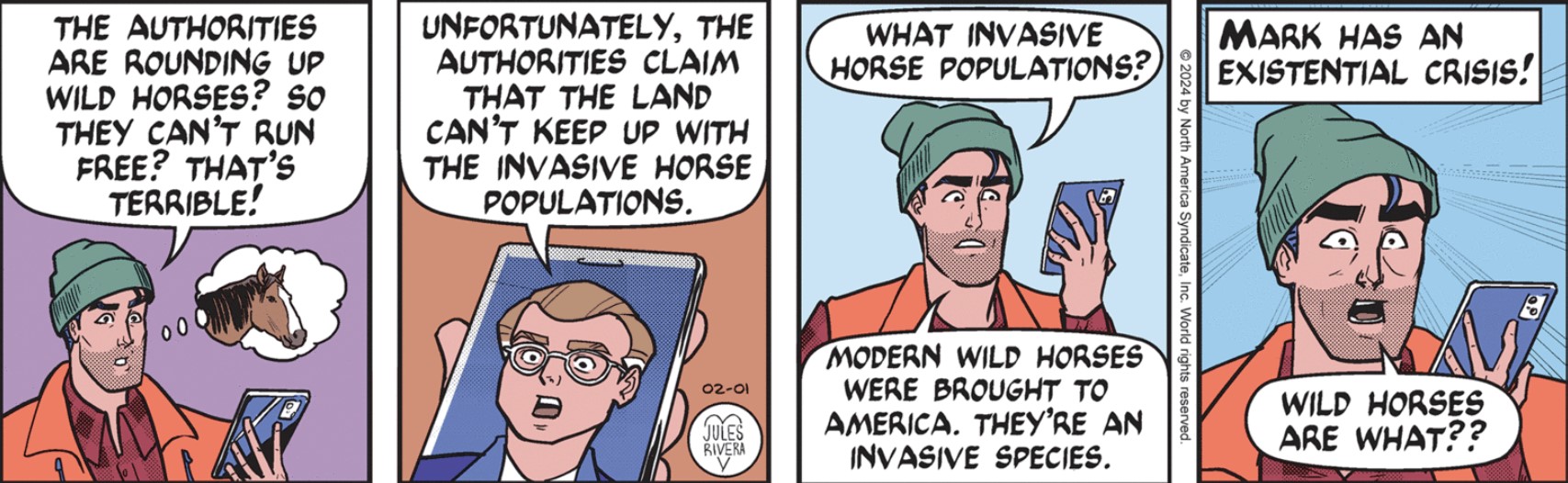 It turns out that—in the real world—wild horses (aka mustangs) have a complex background that involves genetics, ranchers, animals rights activists, land activists, and governments at the local and federal level. None of what I wrote in this paragraph has yet to be brought up in the strip, but seems to underlie the direction of the drama. Let’s hope Rivera presents a fair summation of … oh, who am I kidding!? This is Mark Trail! Whatever Mark decides to do will be considered fair and just. It’s the way things are in the Trailverse. So hang on, buckaroos!