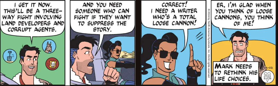 I’m not sure Mark (or Rivera) has this figured out correctly, but I’m willing to take the hit if it’s me. Drop a comment if you think I’m wrong. What is the three-way deal here? According to Diana and Mark’s reasoning, the developers are working hand-in-hand with corrupt government agents of the Bureau of Land Management, not against each other. So, Mark’s participation would make it essentially a 2:1 fight, right? Or do we include the horses as the third leg of this wobbly stool? That interpretation would tie in with the three encircled images in panel 1.