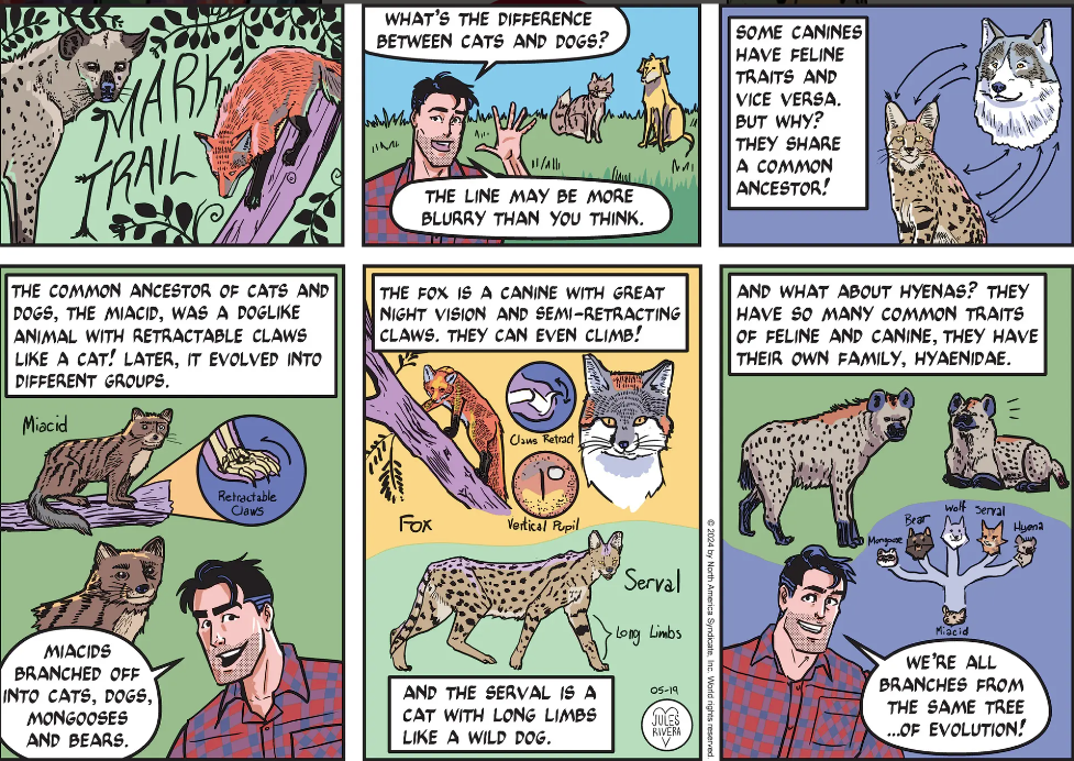 I don’t think much was said about evolution except in the most general sense. So this was an interesting topic for me. Most of the records I researched naturally employ contemporary scientific terminology that makes me wish I had taken more biology classes in college. Anyway, they state that, based on fossils, the miacid was superficially similar to modern martens and civets. End.