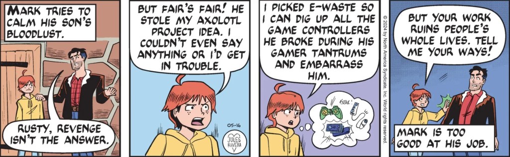 Rusty tried to get his Dad involved in his e-waste science project to help take revenge against Robbie for hoodwinking him out of his original topic. Mark agreed to help, but gave Rusty the mixed message that revenge is not a proper path to follow, though throwing “two fists o’ justice” is just fine. Make of that what you will; it might help explain why kids sometimes don’t understand their parents. I’m not sure I understand the difference, either. But I’m also a blockheaded dad.