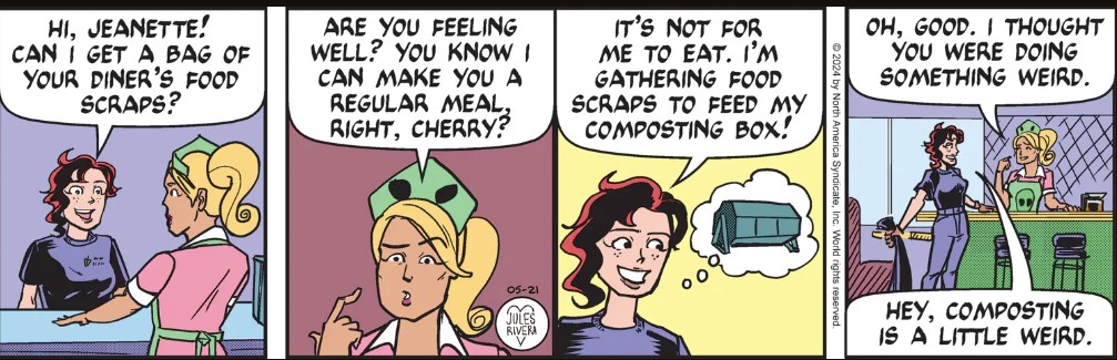 So, Cherry wants to score some free chum for her composter, eh? But why does she think composting is “a little weird”? It’s been around for about as long as humans have been farming. And, along with recycling, it’s commonplace these days. I hope this isn’t Cherry’s latest crusade <yawn!>.