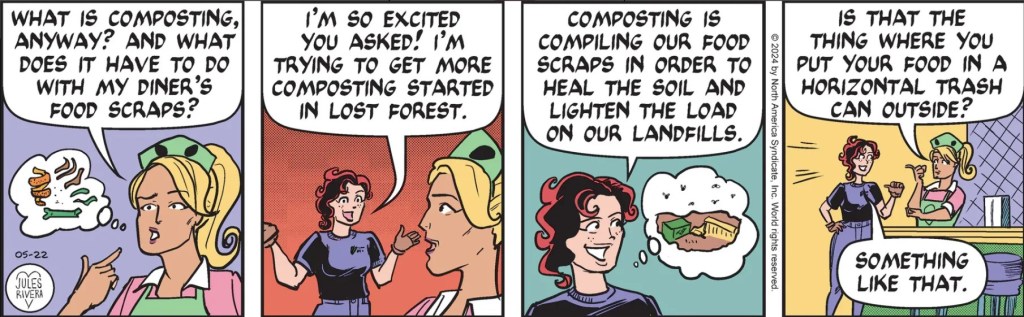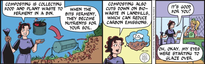 Okay, I get it: Cherry wants her own “Sunday Nature Chat”, like Mark. There’s only one Sunday a week and it belongs to Mark, so Cherry must have decided to create her own version by spending almost the entire week discussing the benefits of composting. Too bad Cherry goes on like a kid delivering her science project in school. No wonder Jeanette was fading fast. Luckily, Cherry finally got the point in panel 4. If this story doesn’t pick up soon, lots of eyes are going to start glazing over.