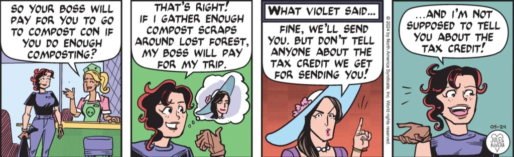 As for today’s installment, the idea that Violet Cheshire would send Cherry to a convention for collecting organic trash for composting is silly (but I do think panel 3 with its burnt-orange background and spot-on narration box is an effective flashback). Since when did Violet become a conservationist, anyway? What would make more sense for this story is for Violet to offer an award (or free trip) to whichever person or family in the community does the most composting over the summer. Yeah, it still sounds boring, but it would at least make more sense. Just think of the intrigue and drama between the contestants!