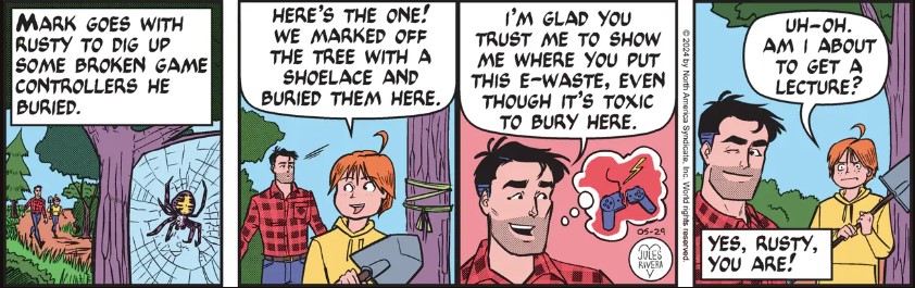 So, Rusty helped Robbie bury the broken game controllers in the woods!?! Now I’m confused. If Rusty fulfills his plan to get revenge against Robbie in the science fair, he also exposes his own complicity in the deed, right? I reckon he hasn’t thought this through. Let’s see if Mark figures it out. You remember Mark; he’s the guy with the big head (or the petite torso) in panel 1.