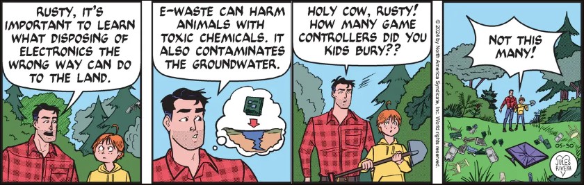 This week we returned to the adolescent adventures of Rusty Trail. He is in school and about ready to announce his topic for the upcoming school science fair. But troublemaker and underhanded “friend”, Robbie, neglected to prepare a topic, having wasted his time playing computer games all weekend. Robbie easily cons Rusty into revealing his topic (the axolotl salamander, subject of the prior Sunday), which Robbie then submits to the teacher before Rusty does! Rusty is suitably angry at Robbie for stealing his idea, though he should have been angry at himself for being so gullible. Fortunately, Rusty quickly came up with a better topic—electronic waste—based on his knowledge of Robbie’s game-playing habit.