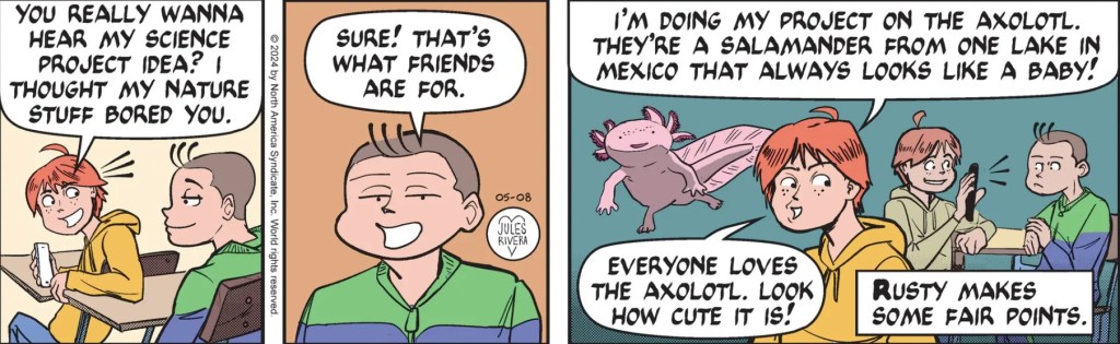 However, one thing missing here is the target of the alleged satire. Is it the legacy Mark Trail strip, itself? In part, I think so. Since she started in 2020, Rivera has been rocking the boat of Mark’s 1950s morale certainty and immunity. But that can only go so far and for so long. Continued, ad infinitum, this trick becomes a parody of itself, as the original strip and its original readers fade into the past. So the satirical references get lost. Then the strip continues as a trivial pastiche looking for an audience. And I think that is where we are. What to do? There is virtually no sense of actual drama or danger to be found. Everything is a put-up joke. Real conservation and ecological issues are resolved by actions too dumbed down or unbelievable to be meaningful.