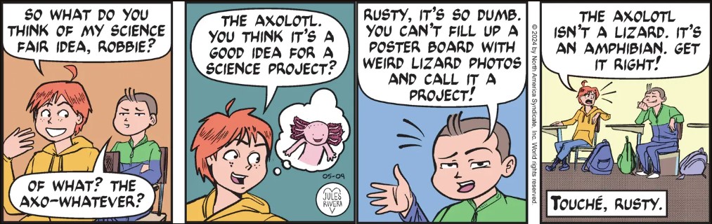 Okay, this dialog is not moving the story along; it is merely two kids bickering. I don’t know why Rivera believes Rusty should score a point (“touché”) in his response, since Robbie already admitted he didn’t have any idea of what an axolotl is. So why should Robbie also know its taxonomic classification? Seen in this light, the conversation could be interpreted as “Rusty tries to ridicule Robbie.” In panel 4, Robbie’s body language indicates that it doesn’t seem to be working. Touché, Robbie!