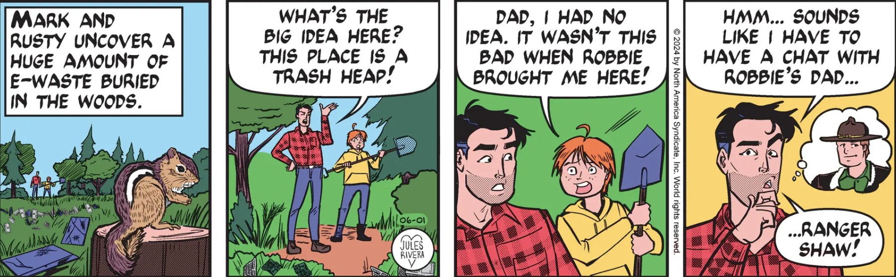 What a coincidence! Rusty tells Mark about his e-waste project for the school science fair, and all of a sudden, Mark has his own show-and-tell about e-waste. I like today’s title panel, though I’d have wanted to see the “Mark Trail” logo appear like actual text on circuit boards. Perhaps, Rivera thought it would be too small? Well, everybody knows the name of this strip, right?