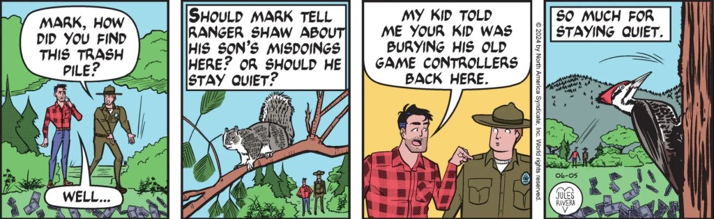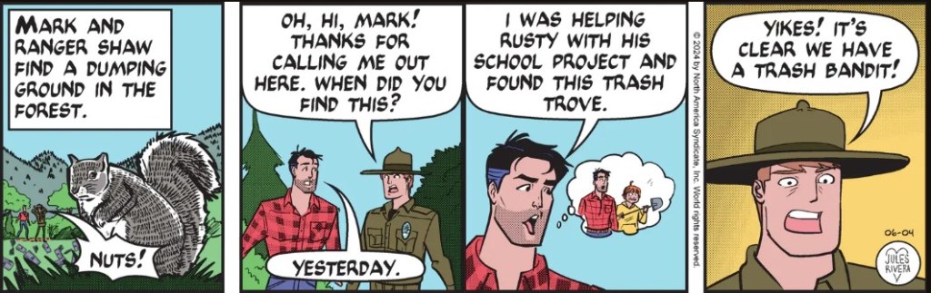 Today, we have Mark in panel 3 harshly questioning Ranger Shaw about his awareness of activity in this part of Lost Forest. Yet, Mark has been acting this week as if Ranger Shaw was not aware of this junk. Why isn’t Ranger Shaw taking control here? He is the one with authority to investigate, not Mark.