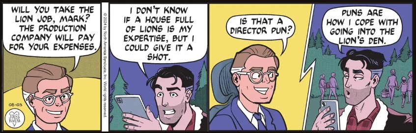 We have today’s strip closing out the week and filling the space on your screen or your newspaper page without furthering the story. Presumably, Jules Rivera is writing her own stories, so she can pace them as she pleases. But can she develop a plot that does not require wasting days with empty blather? We’ve seen this happen over and over. To be fair, Rivera is not unique. Prior artist James Allen did this, as well.