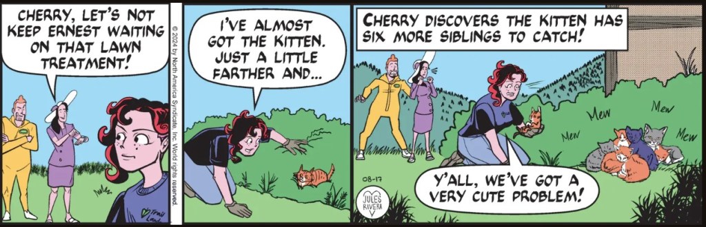 Rivera started another adventure in Cherry’s World this week. Apparently, Cherry’s only landscaping & gardening client worth a mention is Violet Cheshire and her Sunny Soleil Society. It sure would be interesting if she had some interactions with other clients, sort of like that old British show “Rosemary and Thyme”: two professional gardeners who get involved in solving murders while working for different well-heeled home owners.