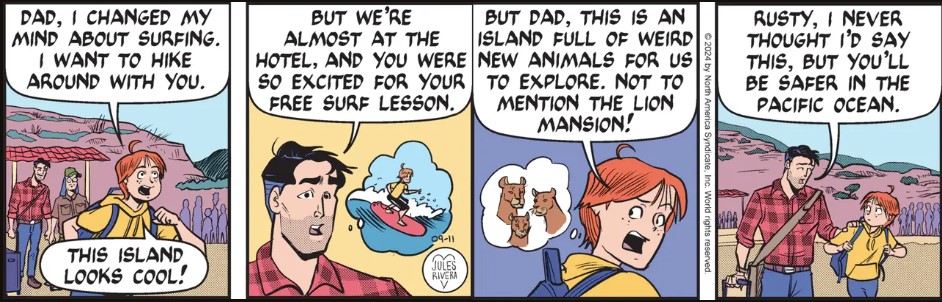I wonder if Rivera thinks this strip comes out once a week, since she uses half of today’s space repeating what was covered yesterday. Perhaps she thinks she is being helpful to elderly Trailheads who still read this strip and who might appreciate the reminder. On the other hand, this reiteration is also a method for padding a story to slow the pace down and help it fill out the week. Perhaps that slick, single-panel-Rusty-drop-off yesterday moved too quickly for an old comic strip like this and it just needs a breather.