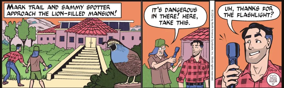 Art Dept. There isn’t much to be said on the positive side and I do not think I need to belabor the obvious. The real question is why Rivera puts out this kind of stuff when it is clear she can do much better. Sure, her syndicate is probably not paying her much money. I get that. Mark Trail is not pulling in the kind of readership and earnings that Garfield or even Luann does, nor even the endless reprints of Peanuts. So, is the lack of quality meant to be some kind of protest by Rivera? Or maybe just her indifference? That seems self-destructive.