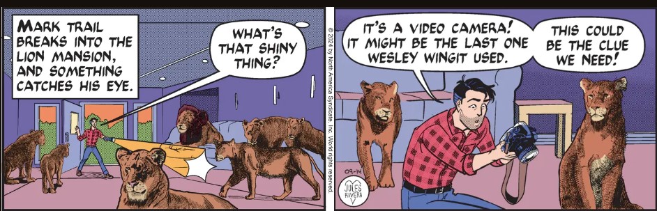 1. Bill Ellis gave Mark a dodgy assignment to find a missing movie director last seen in a house filled with lions. Nobody else is available to do the job. Police can’t handle it. No professional lion tamer or private detective need apply. The assignment specifically requires Mark Trail’s participation, even though he has no qualifications for the assignment and admits to it 2. The location is a “mansion” on an exotic and picturesque island 3. Mark’s contact is a “professional” animal wrangler too afraid to deal with the lions, but declares the untrained Mark Trail can do it. Gullible Mark laps it up 4. There is supposed to be a group of actors sequestered inside the mansion with the lions by the movie director, for the sake of a movie in production, but they are nowhere to be found 5. Mark enters the house and discovers it is filled with inactive lions. He doesn’t seem disturbed by their presence, nor by the lack of actors. Maybe the lions are drugged or just senile. 6. Mark conveniently finds a video camera near the front door, reminiscent of finding the brass lamp in the well house of that great early text adventure game, Colossal Cave 7. Will the video camera provide a series of hints to help Mark locate the movie director? Or maybe it will provide a confession that this entire enterprise is a prank for a new Reality TV show, and Mark is its surprisefirstguest star!