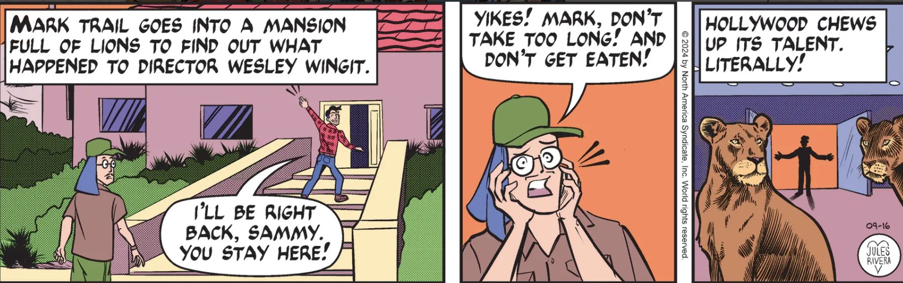 And just how do we know that this production schedule is an important clue to the whereabouts of Wingit? In panel 3, the narration box states that Mark has caught up to the paper, yet he is still inside of the house, looking out the window. In panel 4, a recumbent lioness has somehow managed to snag the schedule. How did lions get outside of the house and why are they just hanging around the yard? The notion that police would not get involved in a situation like this is totally unrealistic.
