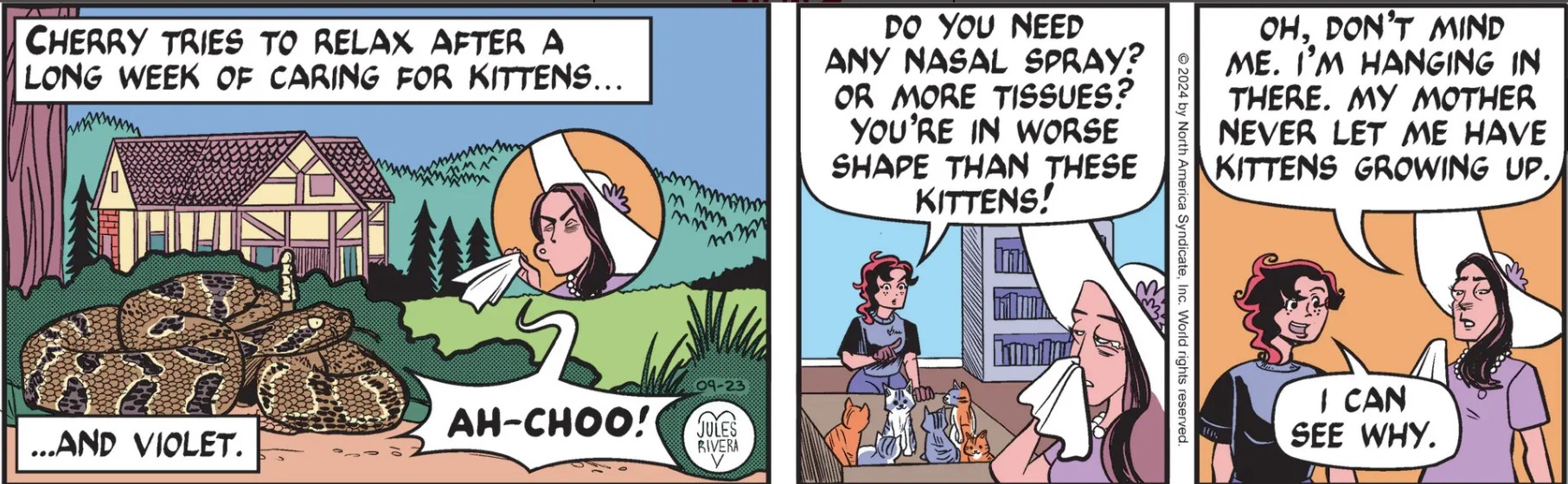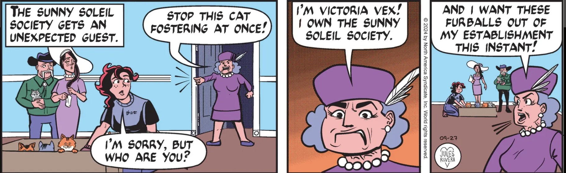 Suddenly, an imperious woman also popped into the room with a take-no-prisoners attitude and demanded that Violet and Cherry remove the kittens forthwith. It seems that she owns the Sunny Soleil Society. In Saturday’s strip, Rivera landed a second hit by revealing she is Violet’s mother! Finally, mom gave Violet 24 hours to remove the kittens, or else!