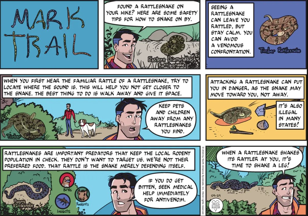 The information today is good, if obvious. But sometimes, we need to be reminded of the obvious! Maybe focus more on the topic (safety around rattle snakes), itself, and skip the gratuitous “why they are important” stuff. For example, what should you wear when walking in areas where rattlesnakes proliferate? Or how about a tip on what not to do if bitten. Rivera can devote another Sunday sheet on the positive benefits of snakes.